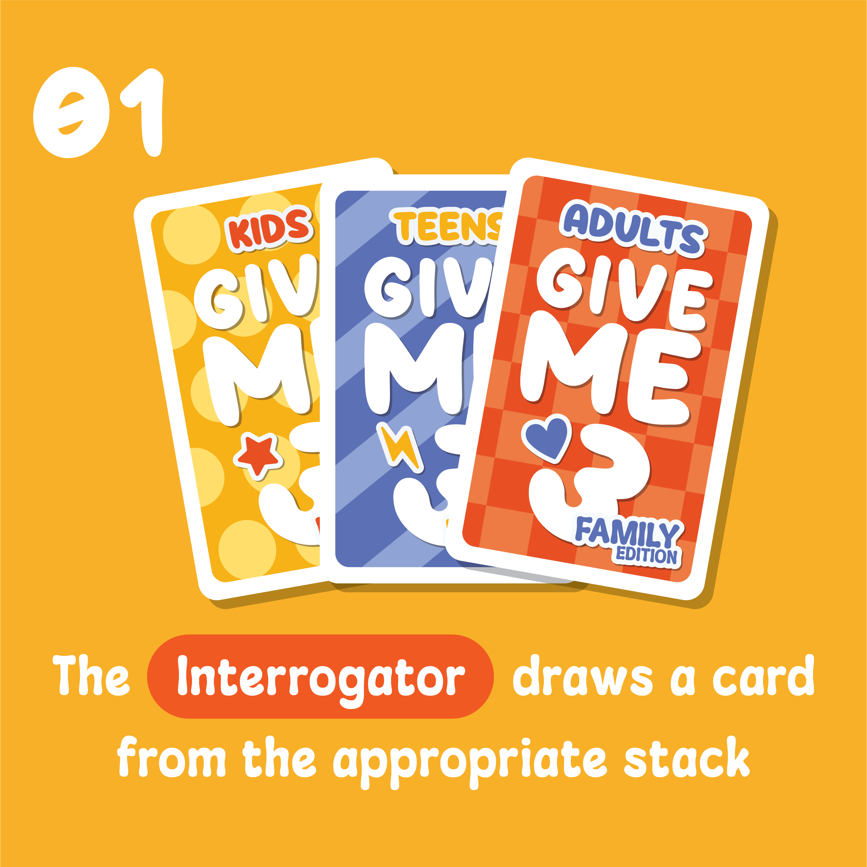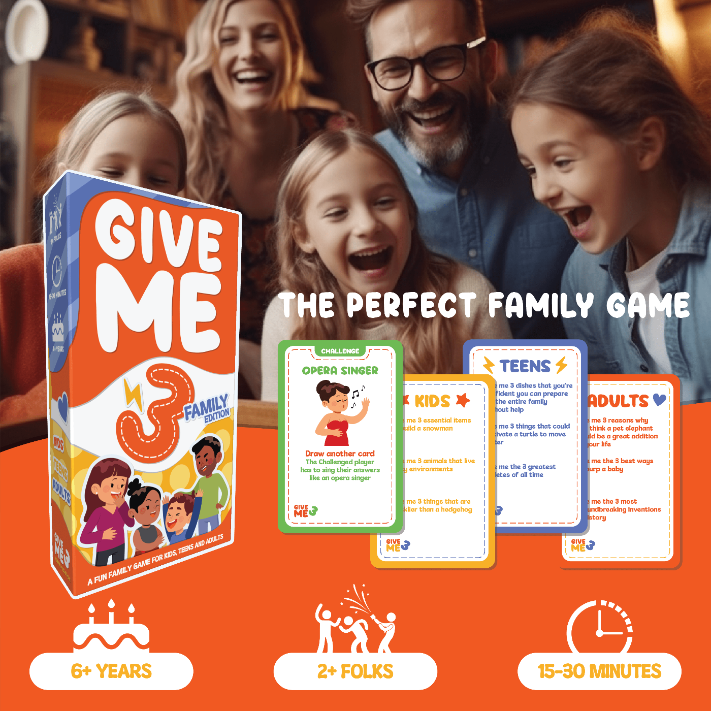 Designed for players aged 6+ and older and suitable from 2 to 12 players, GIVE ME 3 Family is the ideal game for bonding during family game nights.