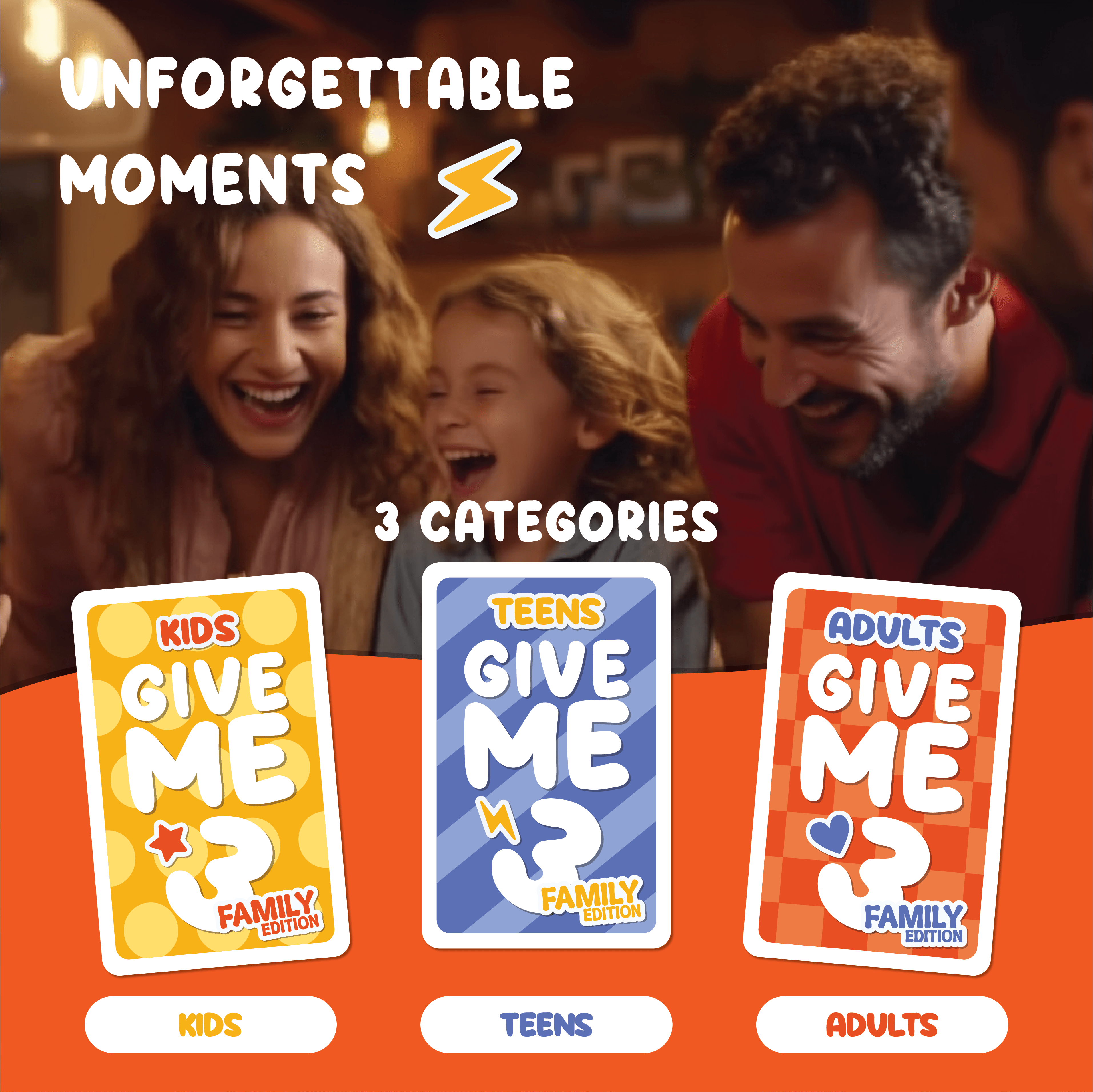 Whether you’re playing with young children, teens, or adults, GIVE ME 3 Family is a guaranteed crowd-pleaser. It’s fast, funny, and full of surprises—ensuring each game session creates memories filled with laughter and excitement.
