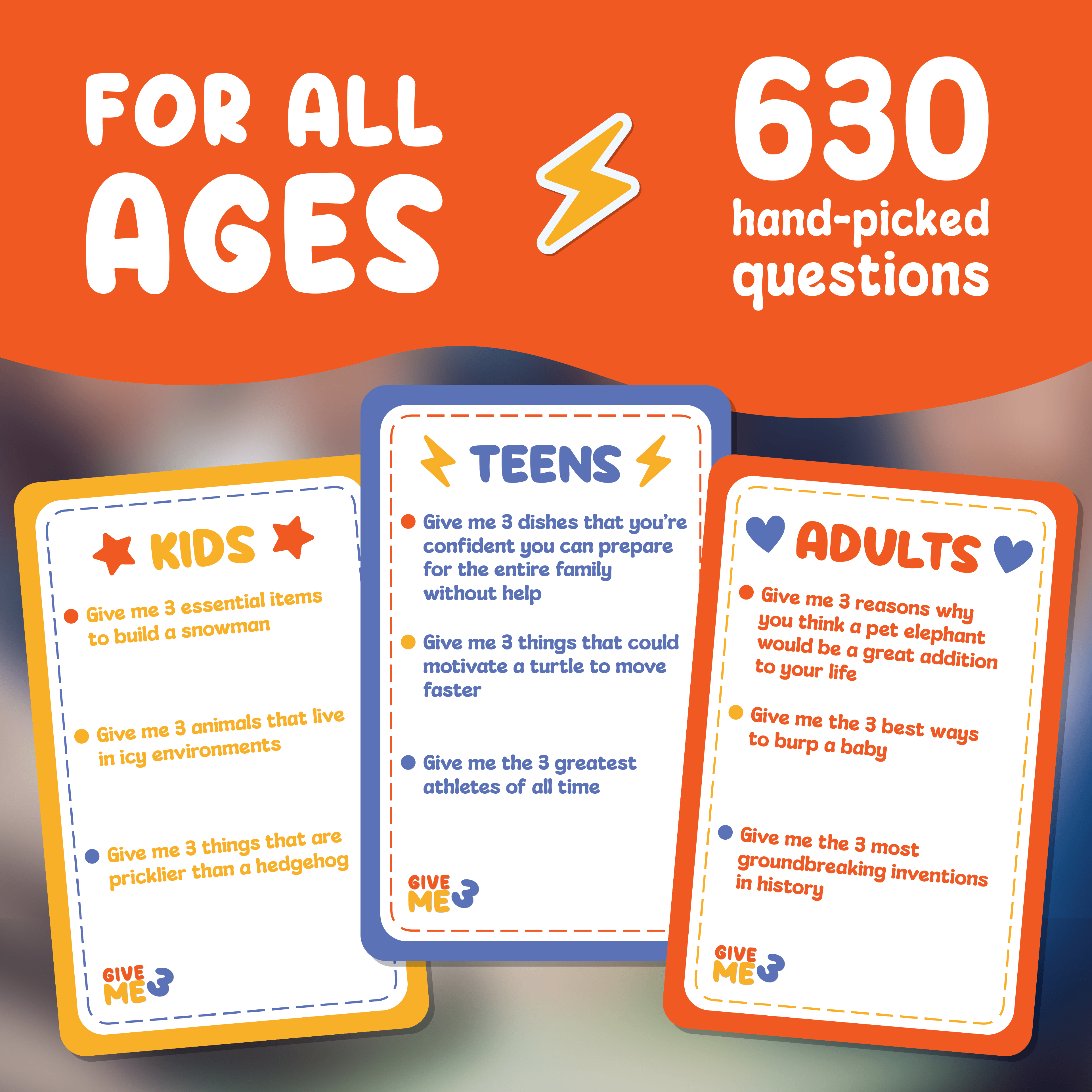 🎉 GIVE ME 3 Family is a fun trivia game for kids, teens and adults that will make the whole family laugh!