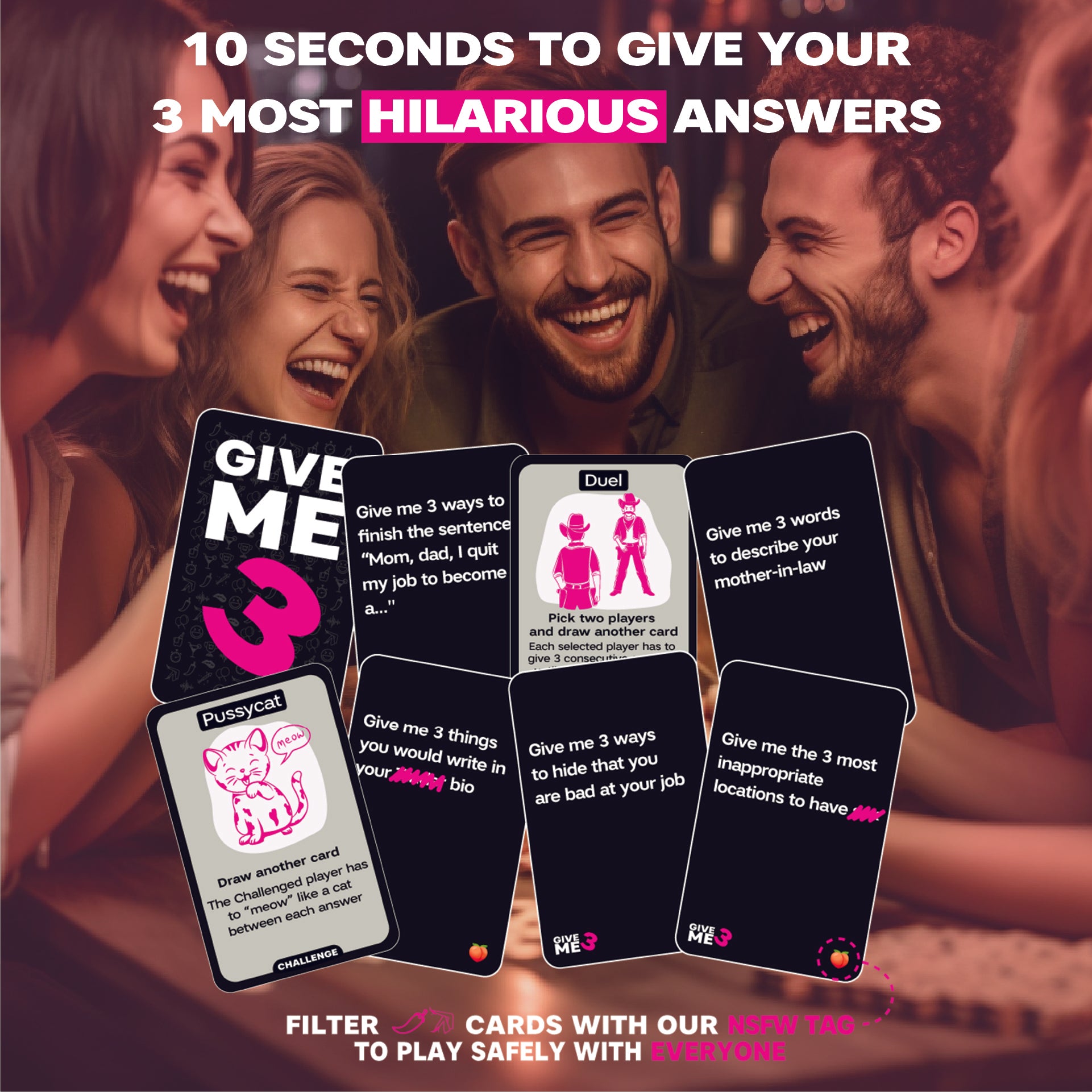 🎉 GIVE ME 3 Party is a fast paced and hilarious trivia game for adults that will make your friends laugh!